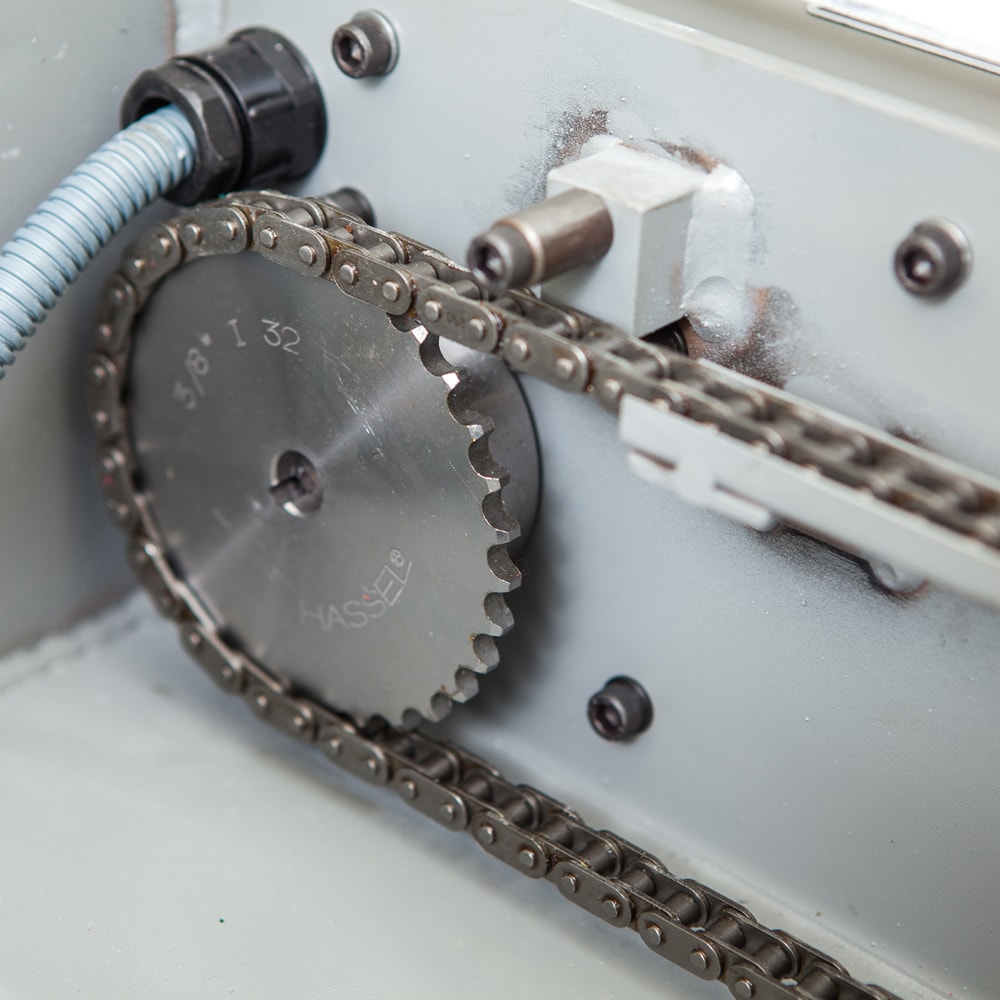 Malzeme kaliteli bir redüktör, bronz bir kavrama ve zincir kullanılarak ileri sürülür. Değişen çaplar için disk yaylara basan somunla kolayca itme kuvveti ayarlanabilir.